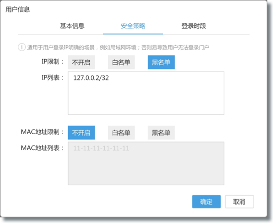 1)支持设置用户登录IP或登录MAC地址的黑/白名单;