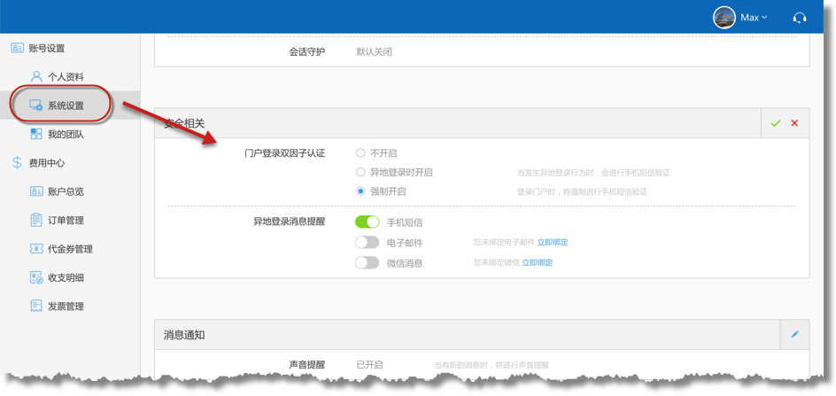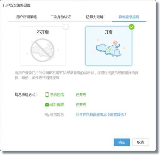 我们针对SaaS平台的门户登录做了安全性的增强,您可以在“系统设置”中设置门户登录双因子认证与异地登录消息提醒,保证本人登录,有效避免非法登录门户行为。