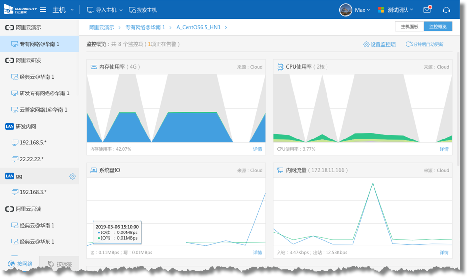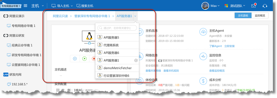 在新版本中,我们支持了主机列表导航栏中直接对云账户、网络、主机的定位,话不多说,看图您就懂: