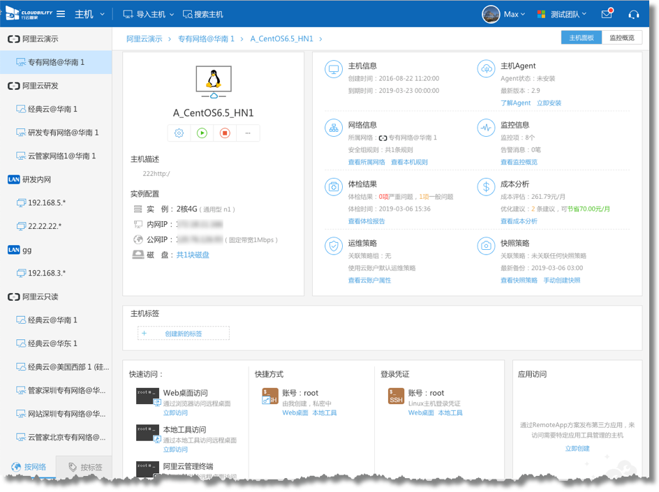 追求极致的用户体验一直是我们的产品标准,在新版本中,我们对主机详情的UI与功能做了重构;在主机详情页,您可以直接看到如:监控信息、成本分析、主机体检等主机资源常用功能,您可以更方便与直观的了解与使用行云管家。