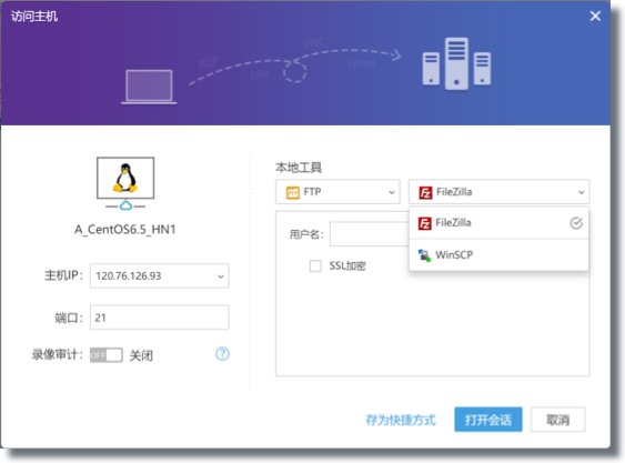 在新版本中,我们完成了对FTP与SFTP协议的支持,您可以通过WinSCP、FileZilla两种本地工具进行对目标服务器的文件传输。