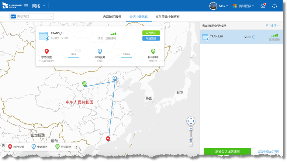 行云管家的一大特性是“全球云加速”,即SaaS平台在全球部署多路会话中转服务,可为您提供流畅的远程桌面会话能力;为了让您更好的使用这一特性,在会话中转优化中,我们将以地图的形式直观的为您展示我们的全球中转服务,同时系统会自动为您提供若干条会话线路(线路由您的位置-会话服务–目标网络组成),您可以通过测试来选择最低延迟的线路进行会话连接,以保证您的会话流畅度。