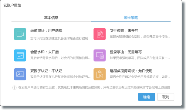 1)云账户默认运维策略:在云账户设置中的“运维策略”模块,可以设置包括:录像审计、文件传输、会话水印、登录事由、双因子认证、远程桌面剪切板在内的六种运维策略;在云账户中进行的运维策略设置,优先级低于主机所属的运维策略,只有当主机没有运维策略约束时才会启用此设置。