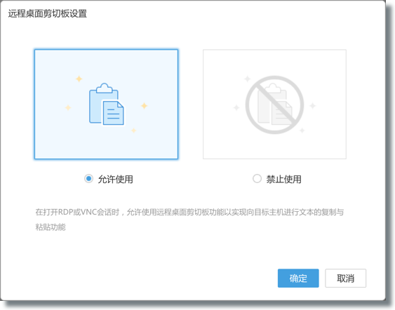 2)远程桌面剪切板限制:是否允许用户在RDP或VNC会话中使用系统剪切板。如果您需要避免成员将Windows主机上的重要文本数据拷贝走,可以禁用远程桌面剪切板。