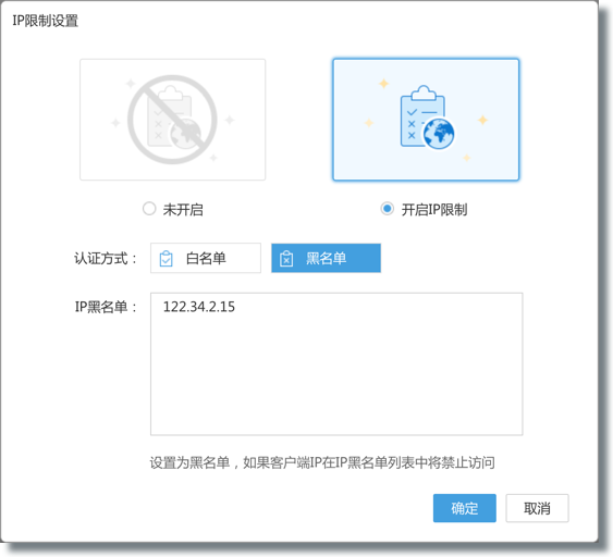 3)访问主机IP限制:IP限制包含白名单和黑名单两种。设置为白名单时,客户端IP必须在IP列表中才允许访问;设置为黑名单,如果客户端IP在IP列表中将禁止访问。