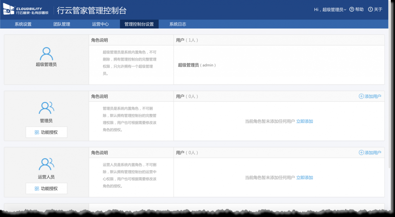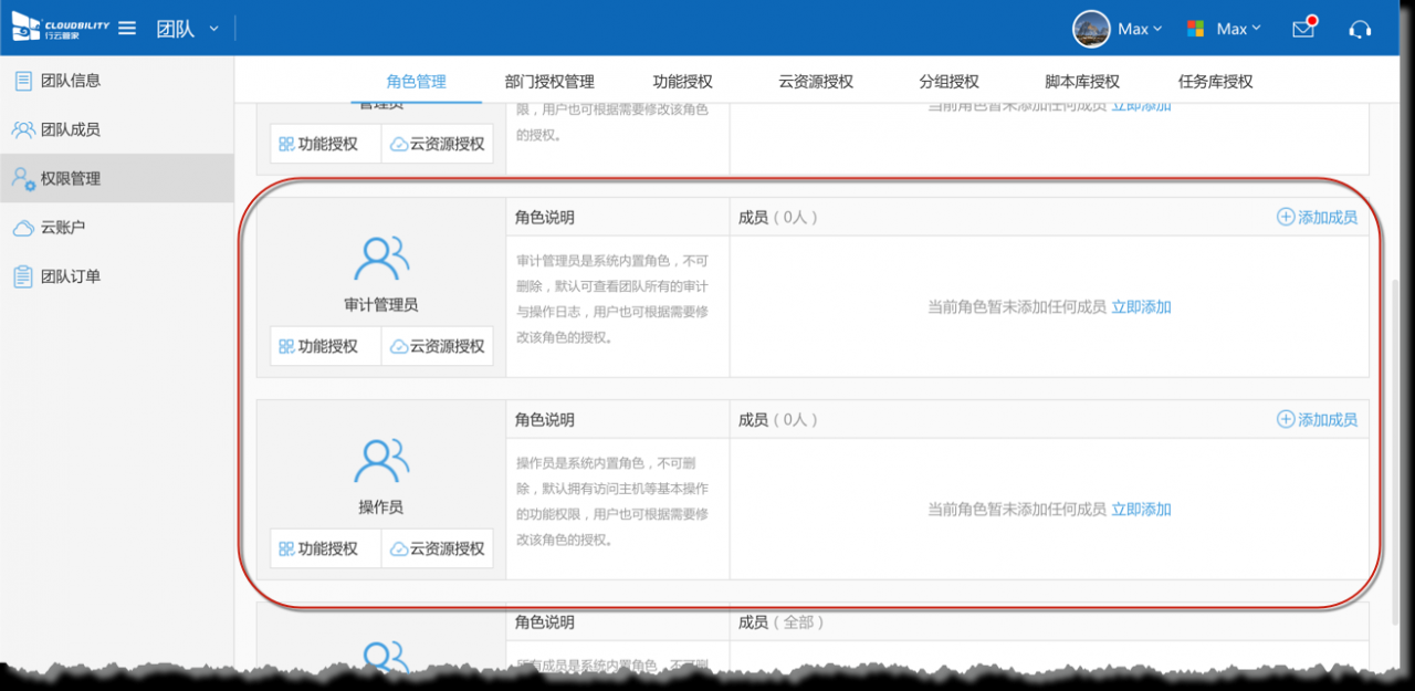 在新版本中我们新增了两个内置角色,分别是“审计管理员”与“操作员”,方便您更快速的完成行云管家的功能授权工作。