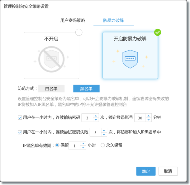 b)黑名单:黑名单中的IP将被禁止登录管理控制台,同时可以设置防暴力破解策略,锁定多次尝试密码失败的登录账号或IP;尝试次数、锁定时间均由用户自定义配置。