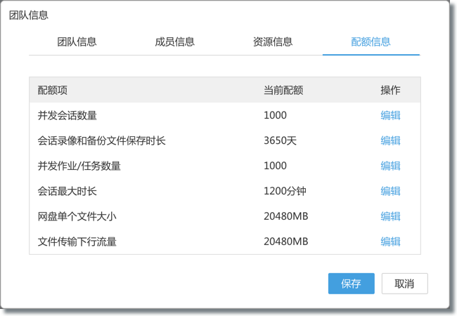 在新版本的管理控制台中,我们支持对某个团队的如:并发会话数、审计录像保留时长、网盘文件大小等信息进行配额限制;以方便用户更好的管理各团队的资源使用情况。