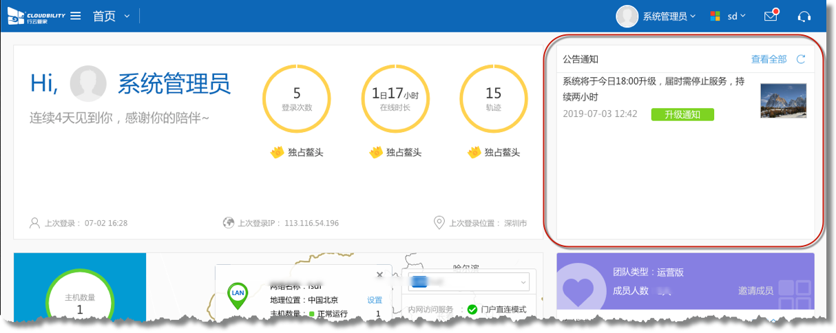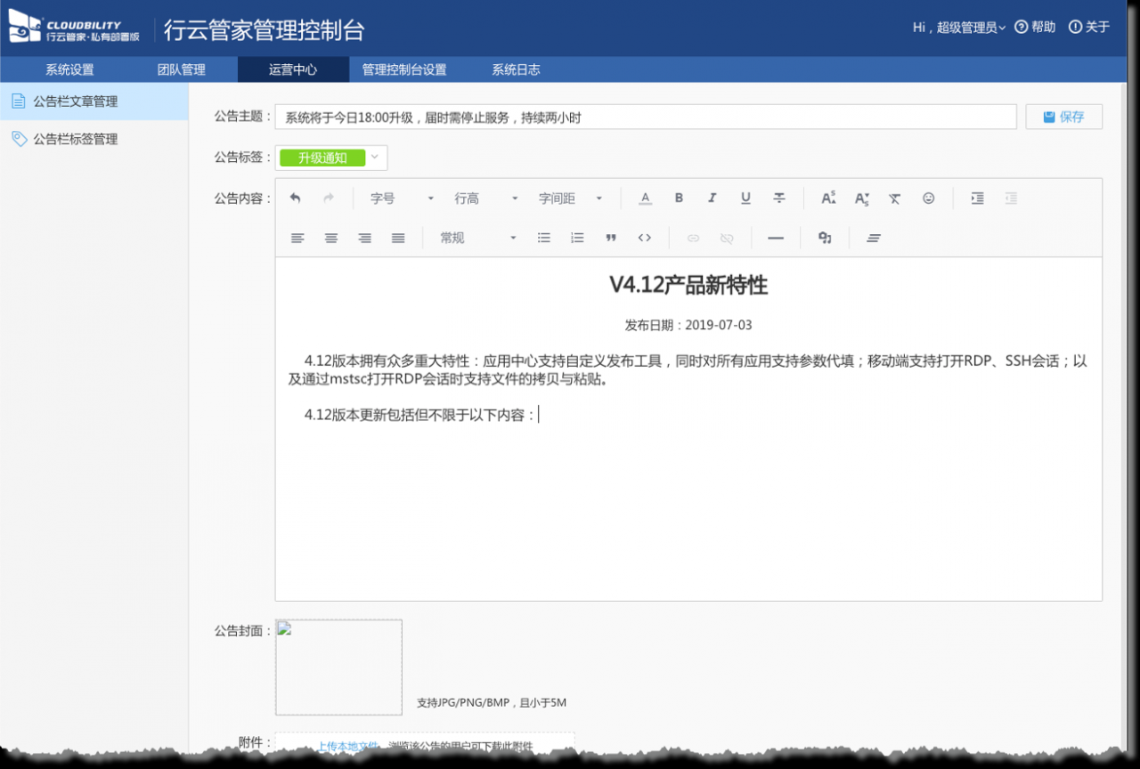 在管理控制台的“运营中心”中,我们支持了公告栏管理,可以在管理控制台自定义发布公告消息到各团队,同时在各团队的首页中可以查看公告消息。