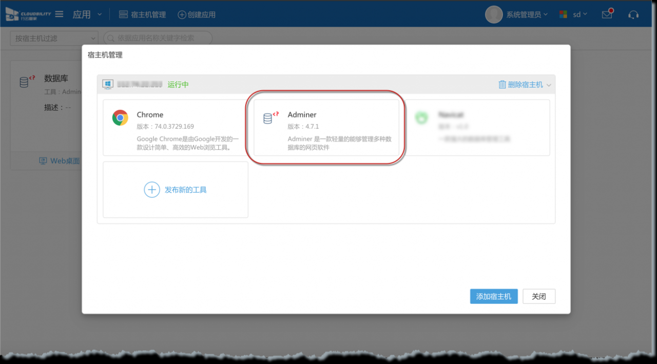 我们在宿主机中内置了一款轻量的数据库管理客户端:Adminer,您可以通过Adminer将您的目标数据库发布成一个应用,同时我们支持参数的代填,您无需将数据库的密码告知其他用户,只需将该应用授权给其他成员即可访问。