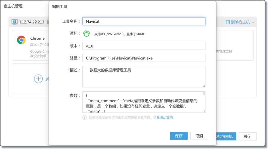 考虑到用户客户端工具的不确定性,行云管家无法将用户所有希望的工具都内置到应用宿主机中;因此我们也支持了自定义发布工具,您只需在应用宿主机中安装好目标工具,然后将工具路径填写到配置界面即可成功发布;同时我们也为自定义工具提供了参数代填的能力,仅需一段Json文件即可配置好访问该工具的表单参数信息。
