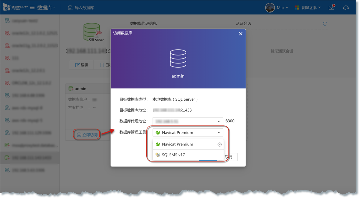 在过去版本中,通过数据库访问方案来访问目标数据库需要使用“访问串”来进行访问;在V4.12中,在“访问串”访问的基础上,我们支持一键唤醒本地数据库客户端工具,目前对Windows客户端支持了Navicat Premium及SQLSMS两个数据库客户端,请 下载最新的浏览器插件程序 来使用。