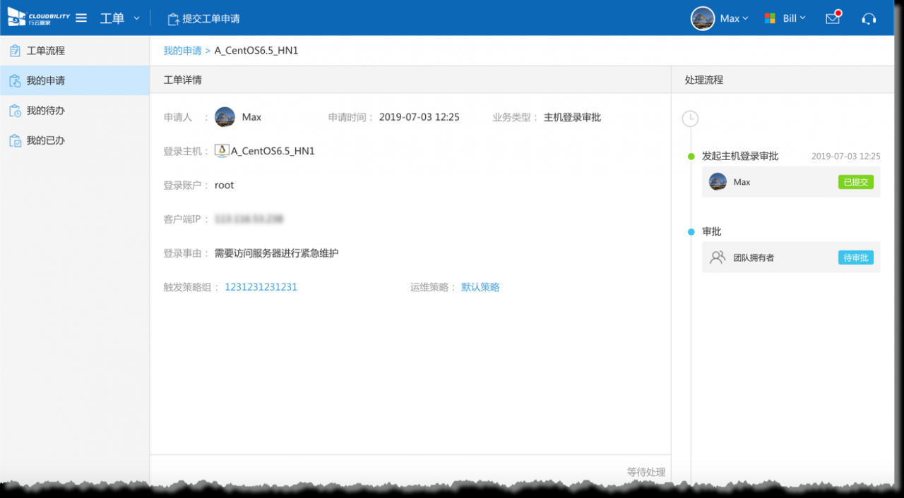 在这里为接下来的版本打一个广告,在下一个版本中,行云管家会支持基于工单对云主机进行全生命周期(创建–>使用–>销毁)的管理,因此我们为这个功能预留了工单中心的位置;而在V4.12版本中,我们将“主机登录审批”与“敏感指令审批”也移动到了工单中心中,未来所有行云管家内的审批工作都将在工单中心中完成。