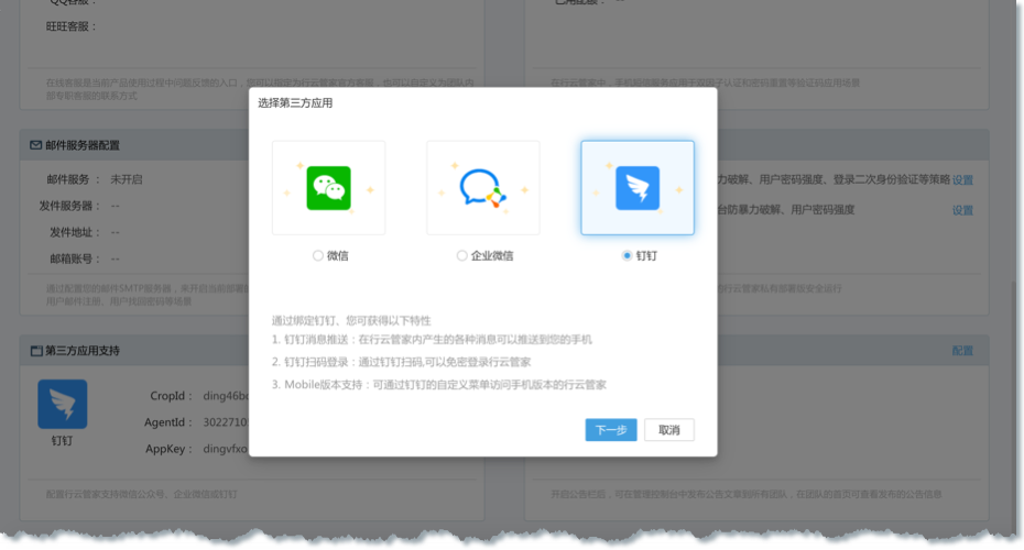 有众多用户抱怨微信公众号的配置十分繁琐,但又不想舍弃第三方应用进行消息推送与认证的功能;因此,在新版本中,我们对企业常用的第三方应用:钉钉和企业微信进行了支持。在管理控制台进行简单的配置后,用户即可在门户中对相应的APP进行绑定,同时也就拥有了消息推送与双因子认证等功能。