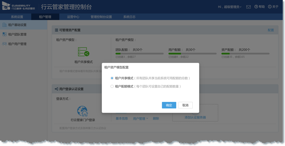 在行云管家过去的版本中,资产配额管理都是以“从License所包含的资产配额总量中为不同团队分配”的方式,也就是“租户配额模式”;但是坦率的来说,对于单团队用户,这种配额管理方式稍显麻烦;因此,在4.14版本中,我们提供了一种新的资产配额模式:租户共享模式;租户共享模式意味着所有团队共享当前系统可用配额的总数。