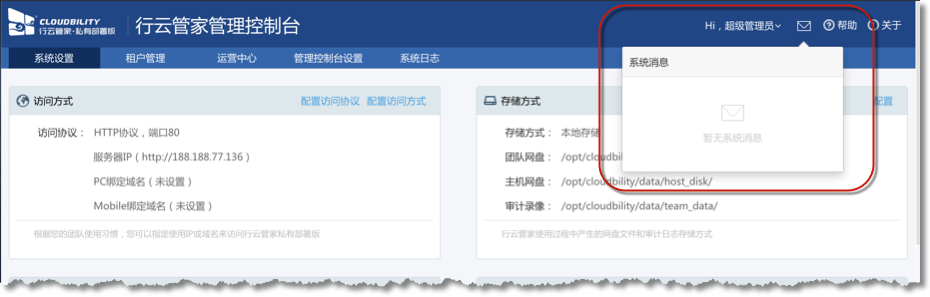 在新版本中,我们在管理控制台中支持了消息中心,可以供用户查看流转到运营中心的工单消息;目前,消息只以站内信的形式进行推送,在后续的版本我们会逐步支持短信、邮件与第三方应用消息的推送方式。
