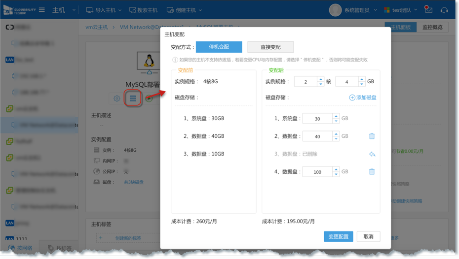 3)支持对VMware主机变配在新版本中,我们支持对VMware主机的直接变配与工单申请变配,同时可根据您具体的变配场景设置是否进行停机变配与具体变配时间。