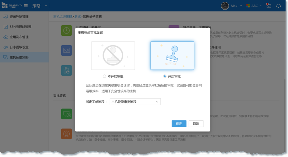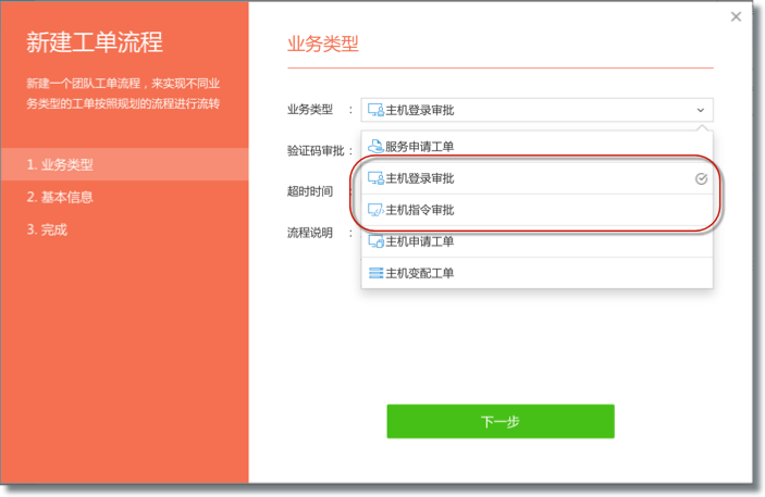 在过去的版本中,运维策略里针对指令黑名单审批与主机登录审批都通过直接设置审批角色来完成,但是这种简单的配置无法很好的覆盖所有的用户场景,如多级审批、多角色审批等;因此在新版本中,我们通过新增两种业务类型的工单:主机登录审批工单与主机指令审批工单来解决这些复杂场景;