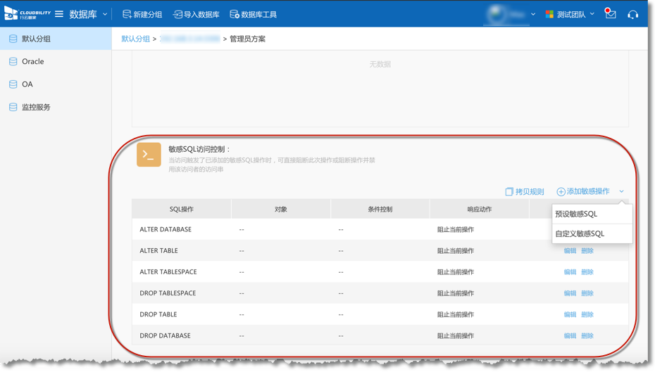 在新版本中我们针对数据库方案支持了运维策略,通过设置运维策略以对数据库安全做更好的保护;其中最主要的功能,敲黑板!我们支持了针对高危敏感的SQL指令拦截机制,删库跑路不再存在!行云管家针对MySQL、Oracle与SQLServer预置了一些敏感SQL,一键添加即可完成设置;同时我们也支持用户自定义敏感SQL与拦截条件,让危险操作无所遁形。