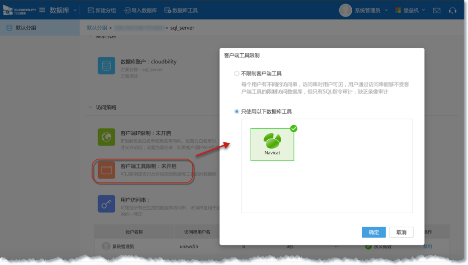 对录像审计于数据库客户端有严格要求的用户也可以在数据库方案的运维策略配置是否启用数据库工具限制。
