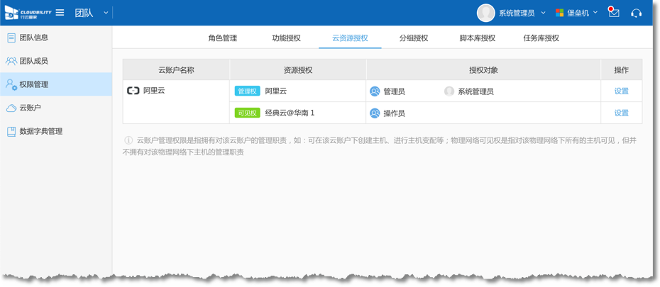 2)云资源授权界面优化:针对云资源授权,我们更换了更为清爽的表格样式,同时强调了云账户管理权限与物理网络可见权限的区别,即:云账户管理权限是指拥有对该云账户的管理职责,如:可在该云账户下直接创建主机、直接进行主机变配等;物理网络可见权是指对该物理网络下所有的主机可见,但并不拥有对该物理网络下主机的管理职责;