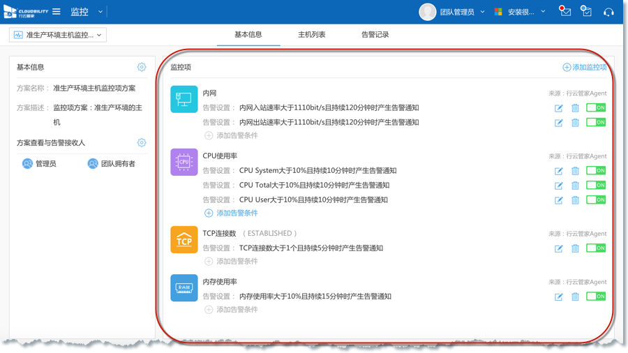 在过去版本中,如果需要对主机进行监控并设置告警条件需要进入每台主机的详情界面进行配置,而用户反馈当想对批量主机进行监控设置时就很不方便;因此在4.17版本中,我们新增了监控方案模块: