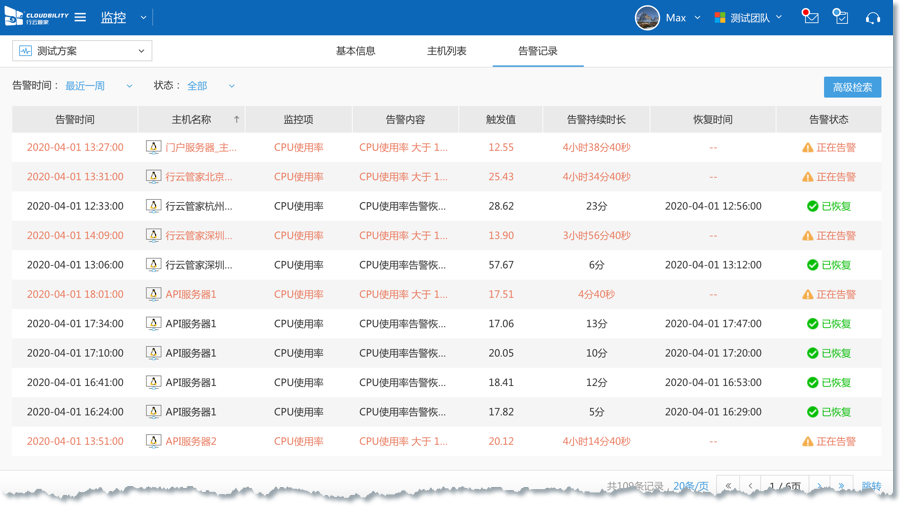 4)可指定监控方案的查看者与告警接收人;同时针对告警方案提供单独的历史告警记录展示: