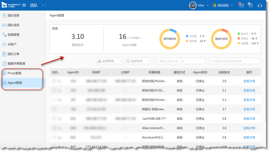 在过去版本中行云管家一直未对Agent及Proxy的状态、版本等信息进行统一的展示,导致用户无法很好的对其进行管理;在新版本中,我们在“团队管理”模块中分别增加了Agent管理与Proxy管理功能,拥有Agent或Proxy管理权限的用户可以方便的查看相关信息,同时当AgentProxy停止时,可以通过短信、微信公众号消息及邮件等方式接受告警信息。