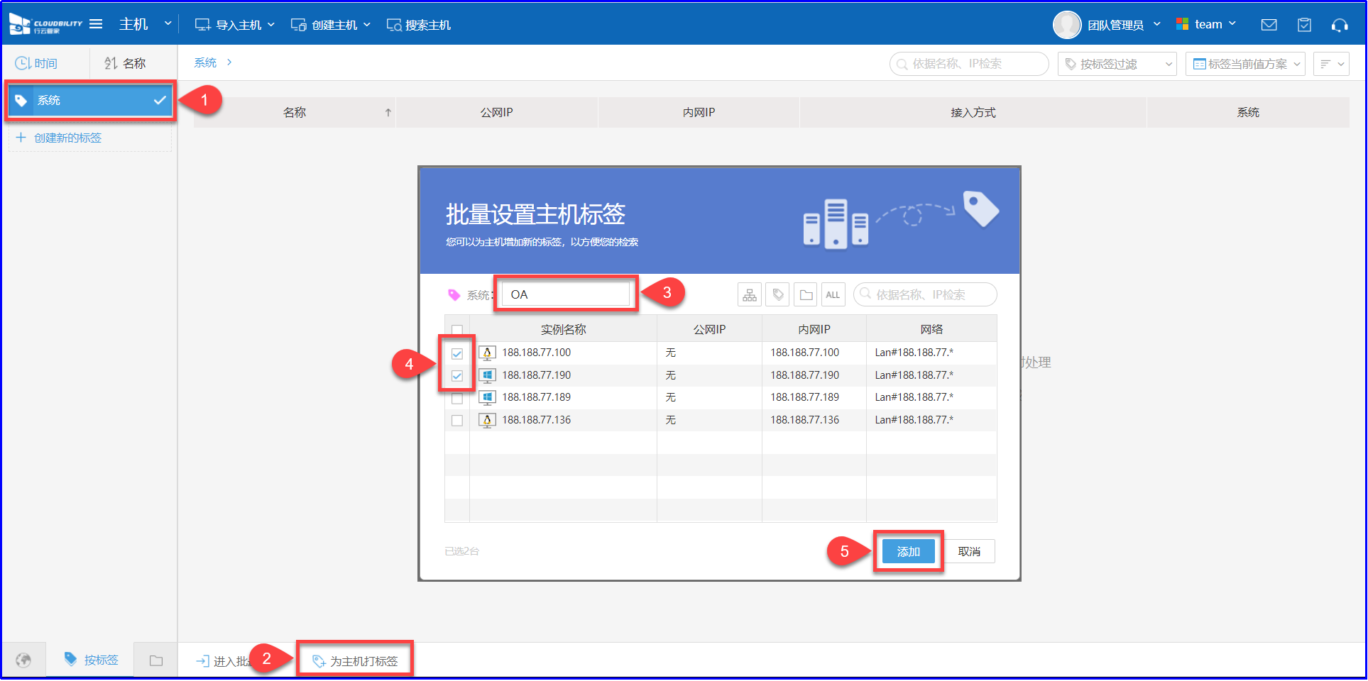 在主机标签列表界面中,选中一个标签,再点击“为主机打标签”,将弹出“批量设置主机标签”框,在“批量设置主机标签”框中,设置标签值,并勾选主机,再点击“添加”,即可以为主机打上标签。