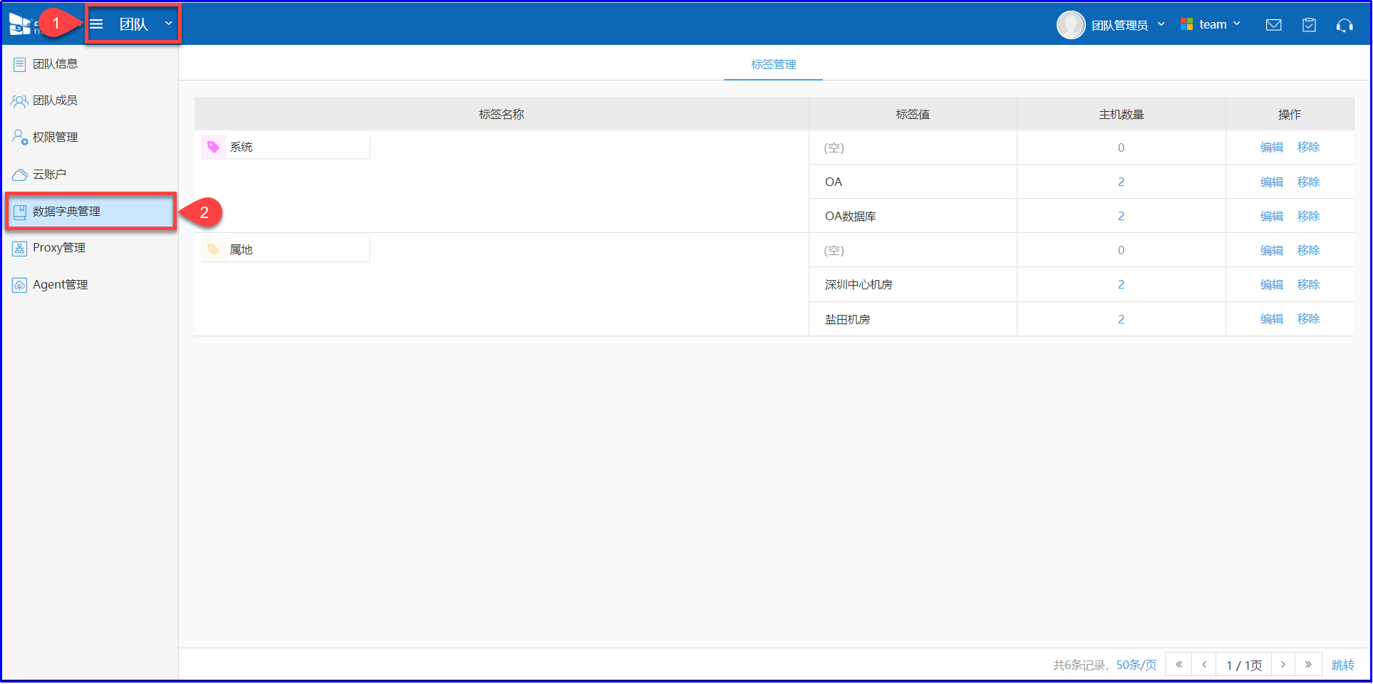 在行云管家的“团队管理”-“数据字典管理”页面中,可以对所有标签进行编辑。