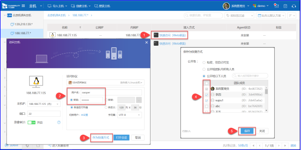 在主机列表界面中,选取某台主机点击“快速访问”,在打开的访问主机框中,指定主机的访问账号及密码,再点击“存为快捷方式”,在保存框中设置快捷方式的授权对象,然后点击“保存”,即可创建访问主机的快捷方式。