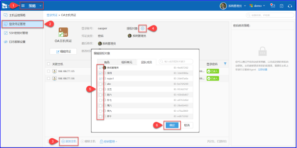 在登录凭证管理中,创建好凭证后,点击“添加主机”可以将凭证与主机进行关联,通过指定授权对象,即可将登录凭证授权予普通运维人员。