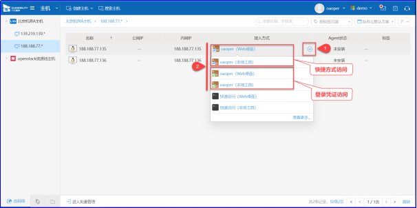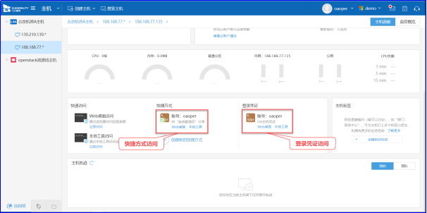 运维人员在主机列表中,能够查看到其有权限访问的云主机,在云主机的“接入方式”中,点击“快捷方式”或“凭证访问”,均可直接访问主机。