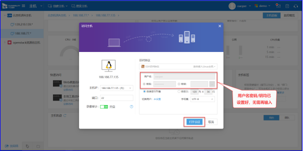 点击快捷访问入口后,在打开的访问主机框中,访问主机所需的用户名、密码(或密钥)均已设置好,无需再指定,直接点“打开会话”即可访问主机。