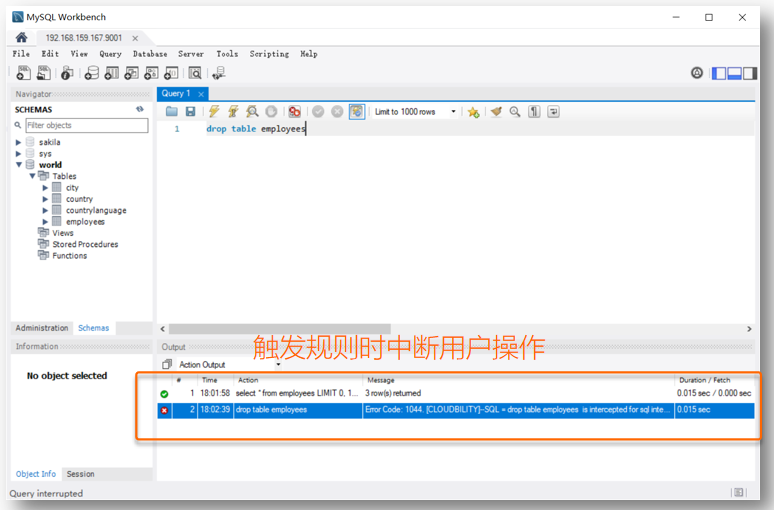 可在行云管家“SQL拦截”中定义敏感指令规则,当用户的SQL操作触发拦截规则时,可以中断用户的操作并予以提醒,甚至可以强行中断用户当前的数据库连接并禁止后续访问;