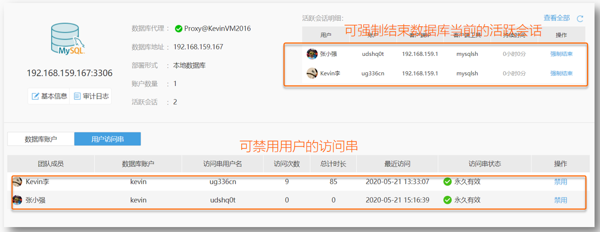 可在行云管家中查看生成的所有访问串并可决定是否予以禁用,从而禁止用户的继续访问,可在行云管家中查看当前数据库的所有活跃会话,并可决定是否强制结束;