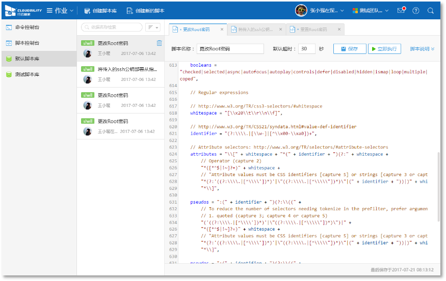 行云管家堡垒机内置了业界知名的 SaltStack 脚本库,并支持用户新建自定义脚本,能够批量对主机执行脚本、命令,以及将文件批量分发至目标主机、批量从多台主机采集文件,实现对多台主机的各种批量运维操作。