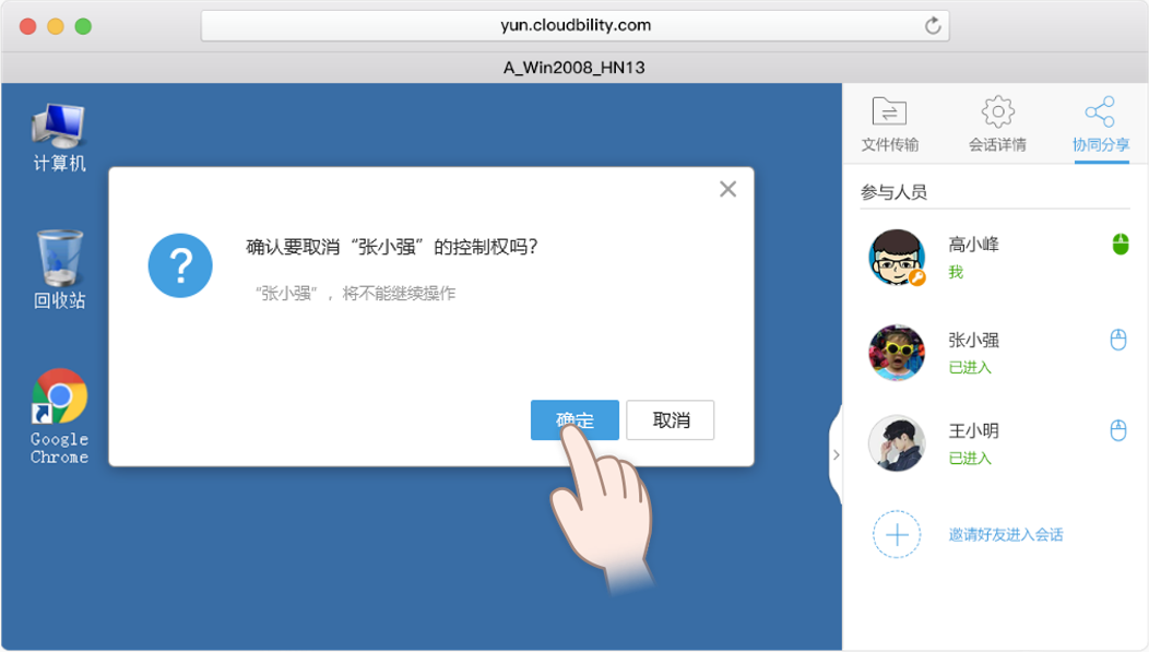在行云管家堡垒机中,任何一个远程桌面都可开启会话分享功能并形成一个分享链接,只需将此链接发送给您的好友,即可邀请好友进入同一个远程桌面。多人之间面对同一个工作场景,并自由切换操作控制权;协同过程中,用户免装软件、免交密码、全程审计。