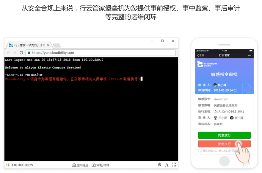 飞机黑匣子用于灾后事故的回溯追责,行云管家的职责远不止于此,它提供了事前授权、事中监控、事后审计等核心特性。