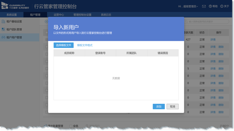 在管理控制台中的租户用户管理模块,我们支持了批量导入用户,方便您快速的将团队成员的信息通过Excel文件导入至行云管家;同时我们也提供了批量导出全部用户的功能,便于您对现有用户信息进行统计与管理。