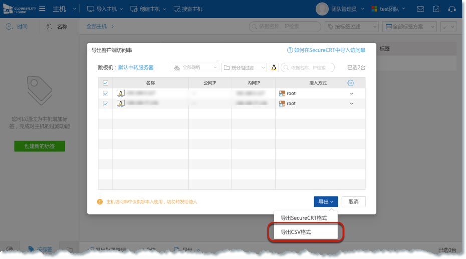 在上次更新中,我们支持了将主机访问串导出为SecureCRT的配置文件;在新版本中,为了用户更方便的使用Putty、XShell等本地工具来使用访问串登录主机,我们提供了将主机访问串导出为CSV格式文件的功能。