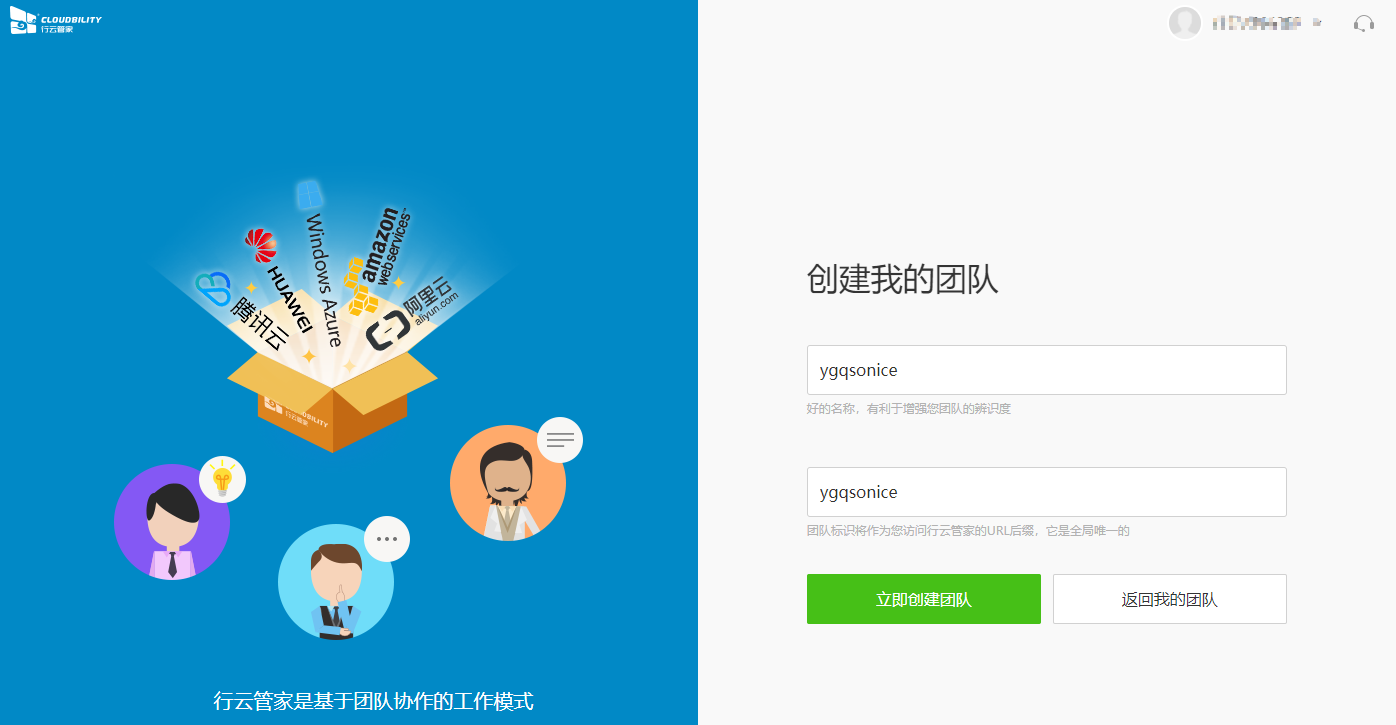 首先,我们在yun.cloudbility.com上注册一个账号,然后创建一个团队。