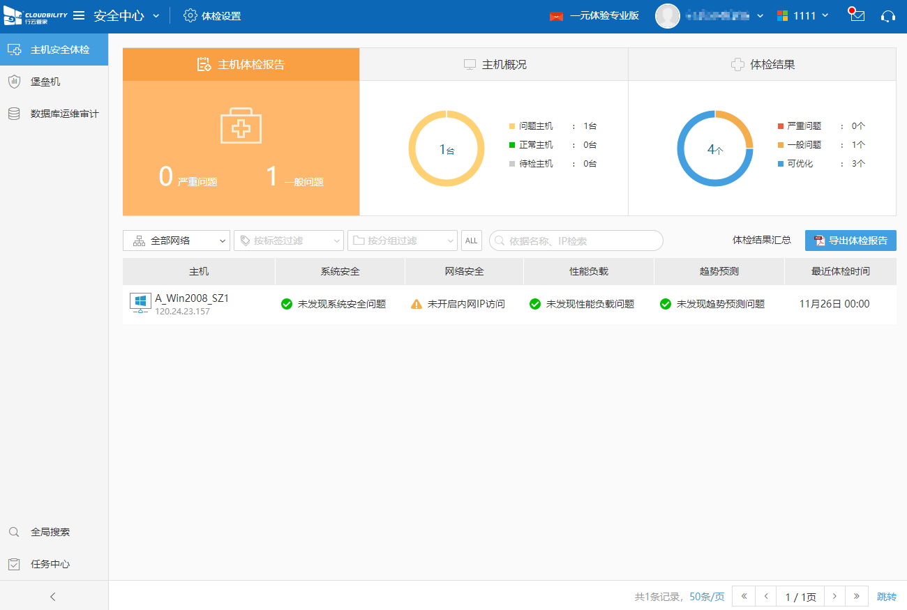 进入“安全中心”,有主机安全体检、堡垒机、数据运维审计3大管理功能,主机安全体检提供从系统安全、网络安全、性能负载、趋势预测四个维度对主机进行全方位的安全扫描,还可一键导出体检报告。