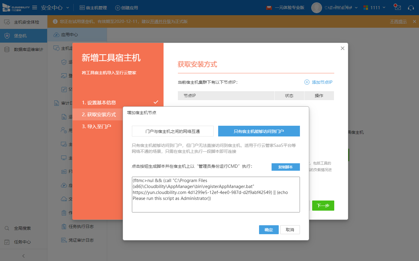 堡垒机,通过添加宿主机到堡垒机中,将宿主机统一纳入到堡垒机中进行监管,应用的安装和使用均在堡垒机的应用中心完成,此外还提供主机运维控制、审计日志2大管理功能,从运维策略、登录凭证、SSH密钥3个维度出发实现主机运维的管理,审计日志则有多达10种审计维度,通过堡垒机监管所有的访问、操作、执行等行为,全程均可被记录,记录的方式有日志记录和录像记录两种,保证安全合规。