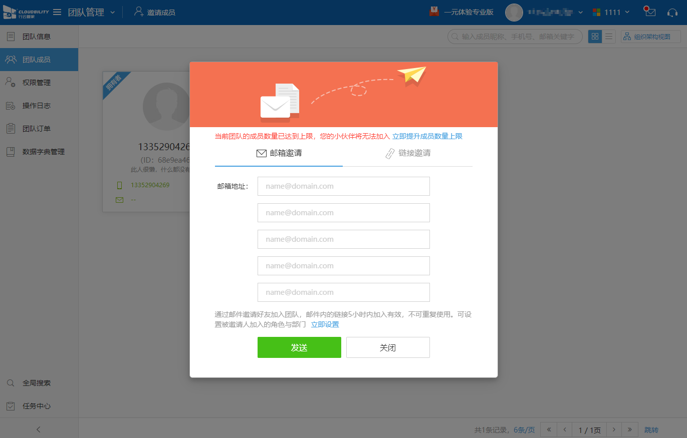 我们现在切换到“团队管理”,在1min章节中创建我的团队之后会提示邀请其他成员加入团队,在这里我们也可以通过团队成员=》邀请成员,继续邀请成员加入行云管家,邀请的方式提供邮箱邀请和链接邀请两种方式。