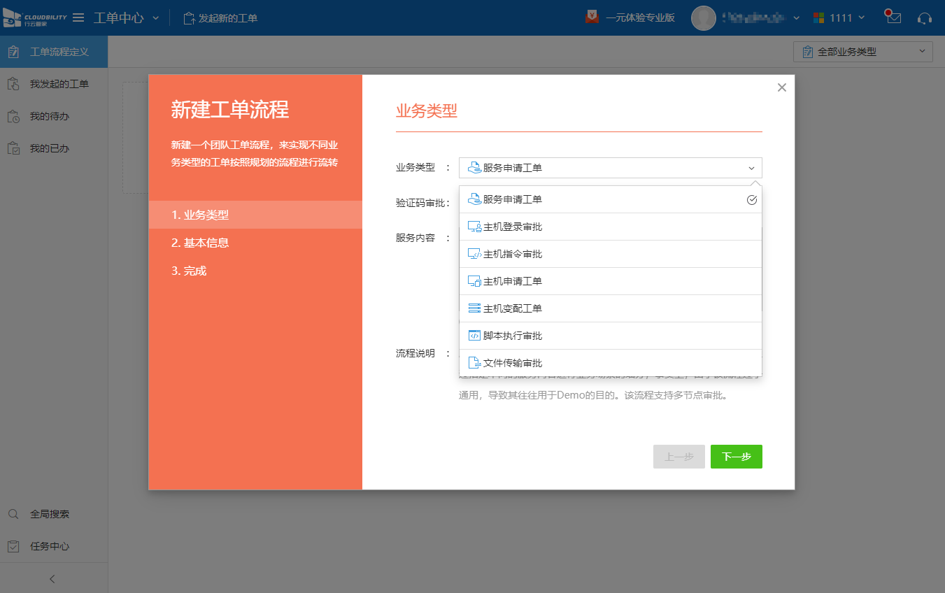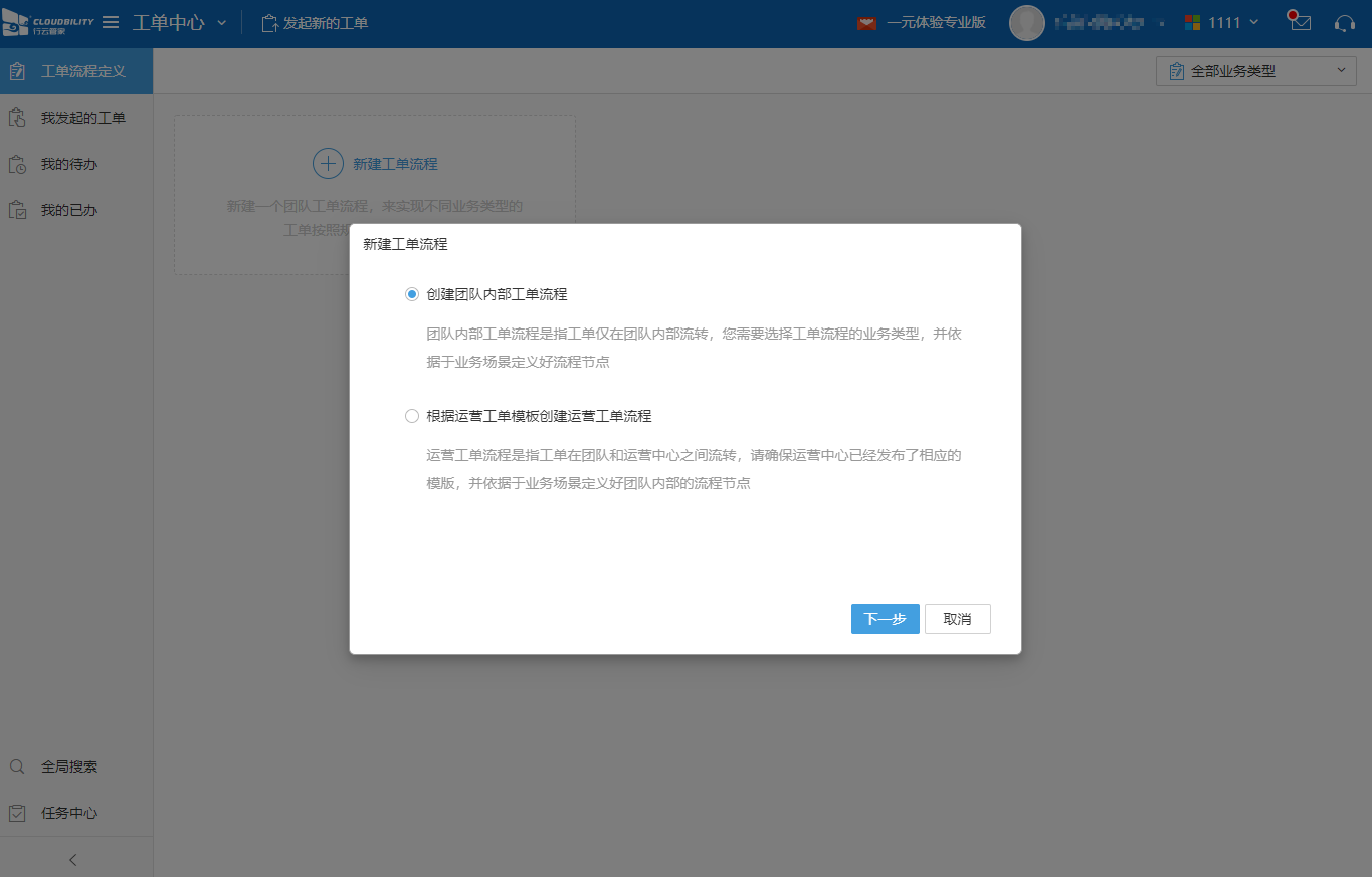 来到“工单中心”,我们可自定义工单流程,还能查看我发起的工单、我的待办、我的已办,其中团队内部工单流程支持7种工单业务类型。