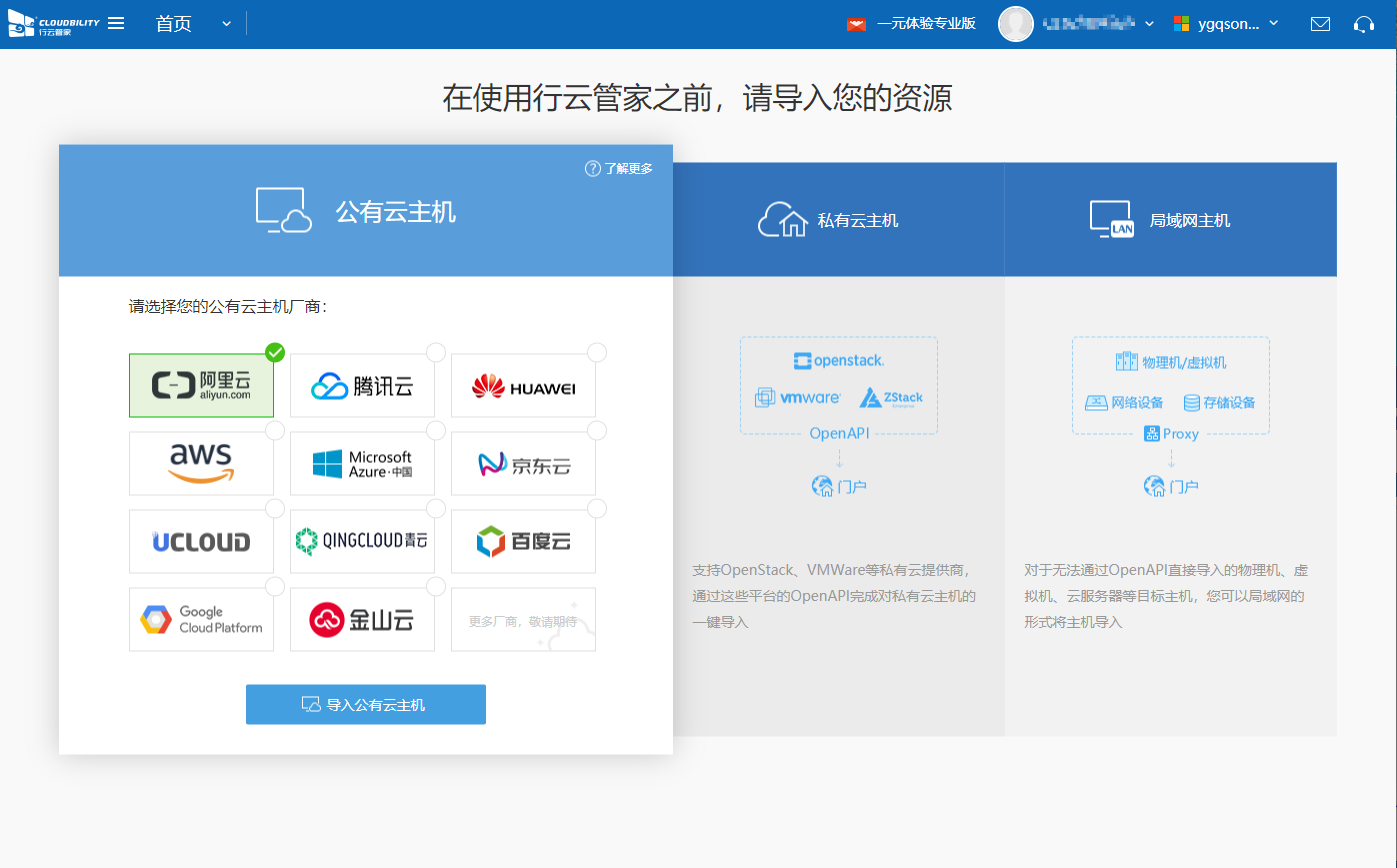 按照指引,会出现“邀请团队成员”界面,这里我们直接跳过,进入导入公有云主机、私有云主机、局域网主机的界面,通过导入不同的云计算资源,可实现多云、混合云管理。