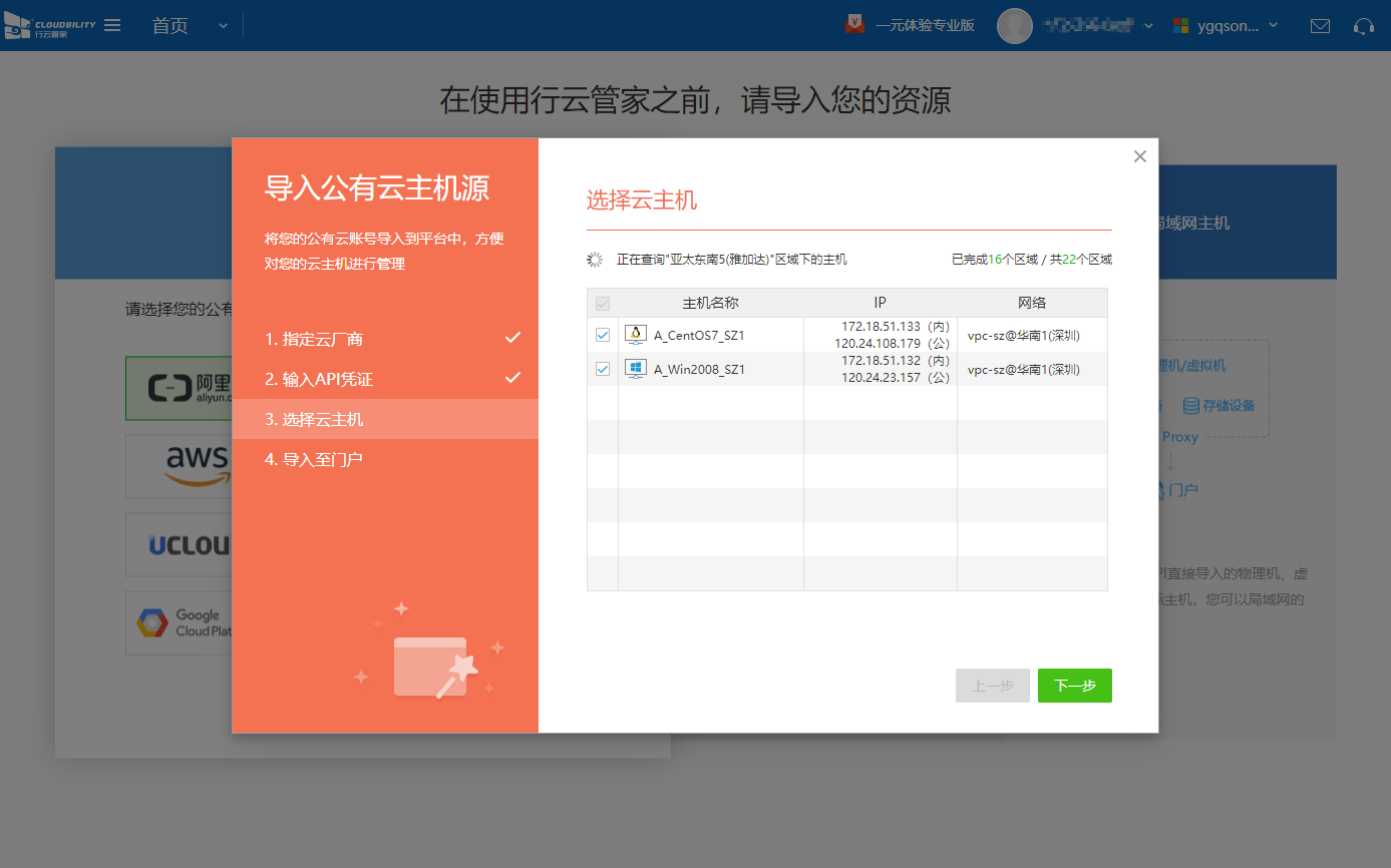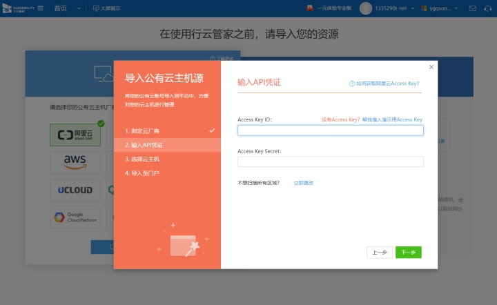 我们选择导入阿里云主机,如没有主机的Access Key ID和Secret,可以用行云管家提供的演示Key(部分功能会受限),下一步之后可以选择不同区域下的云主机,勾上你想要的主机,进入下一步,在等待约5秒后,提示云主机导入完成。