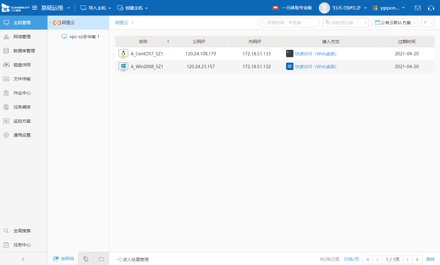上述步骤完成之后,我们直接就进入到“基础运维”,主要有3大管理功能, 硬件类管理:主机管理、网络管理、数据库管理、磁盘管理、文件传输; 任务管理:作业中心、任务编排、监控方案; 通用设置:比如设置云账户、Proxy、Agent等,在这里我们可以快速完成一些运维日常任务,如进入云主机桌面、上传补丁下载日志、脚本批量执行、建立硬件使用监控方案等。