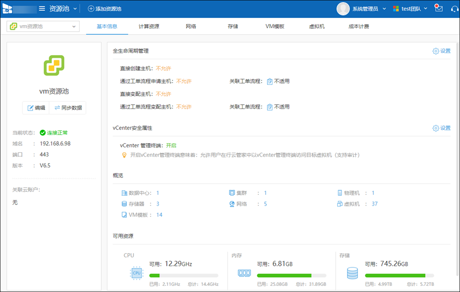 资源池是vCenter以及OpenStack中灵活管理资源的逻辑抽象。行云管家通过API接口与vCenter、OpenStack对接,实现像管理公有云资源一样管理vCenter和OpenStack资源。